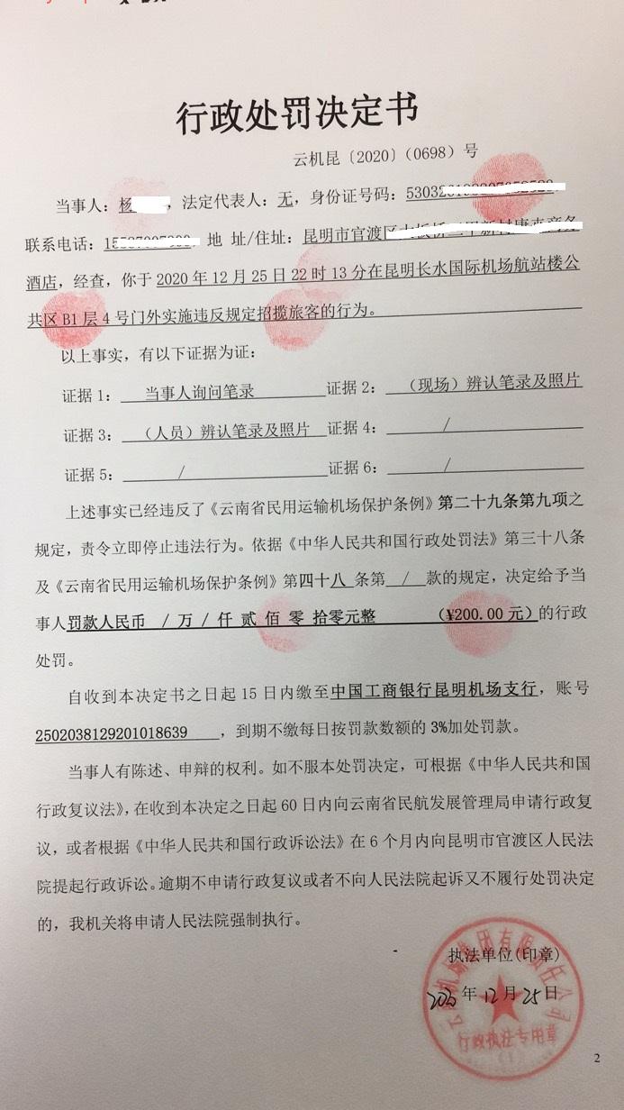 行政处罚决定书 云机罚 昆{2020} (0698)号