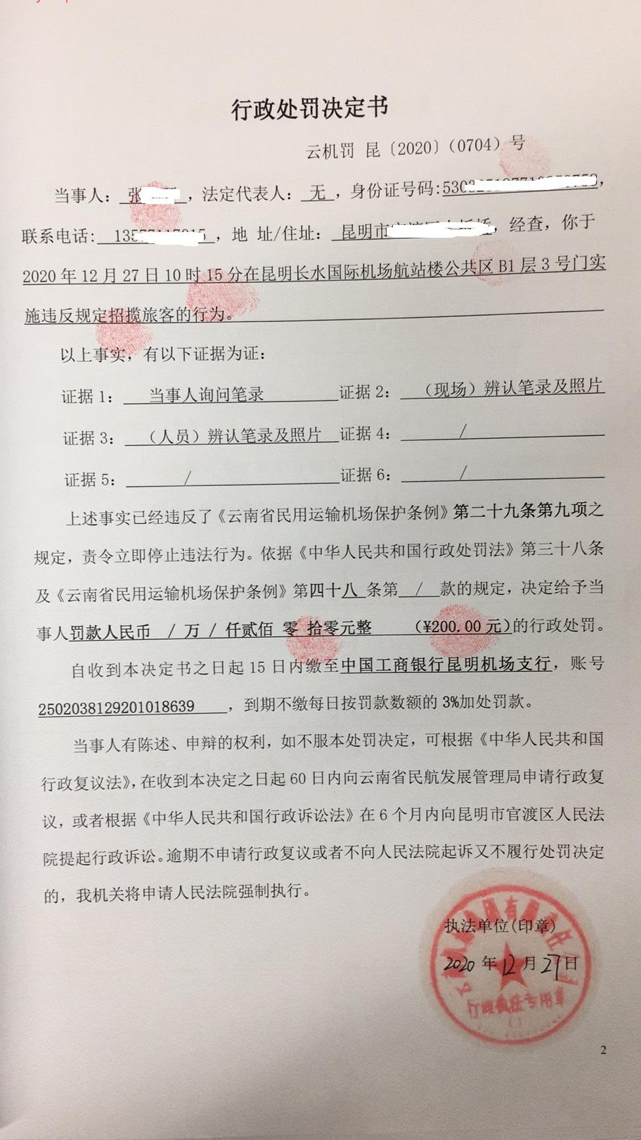 行政处罚决定书 云机罚 昆{2020} (0704)号