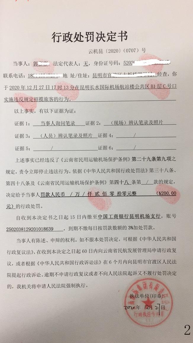 行政处罚决定书 云机罚 昆{2020} (0707)号