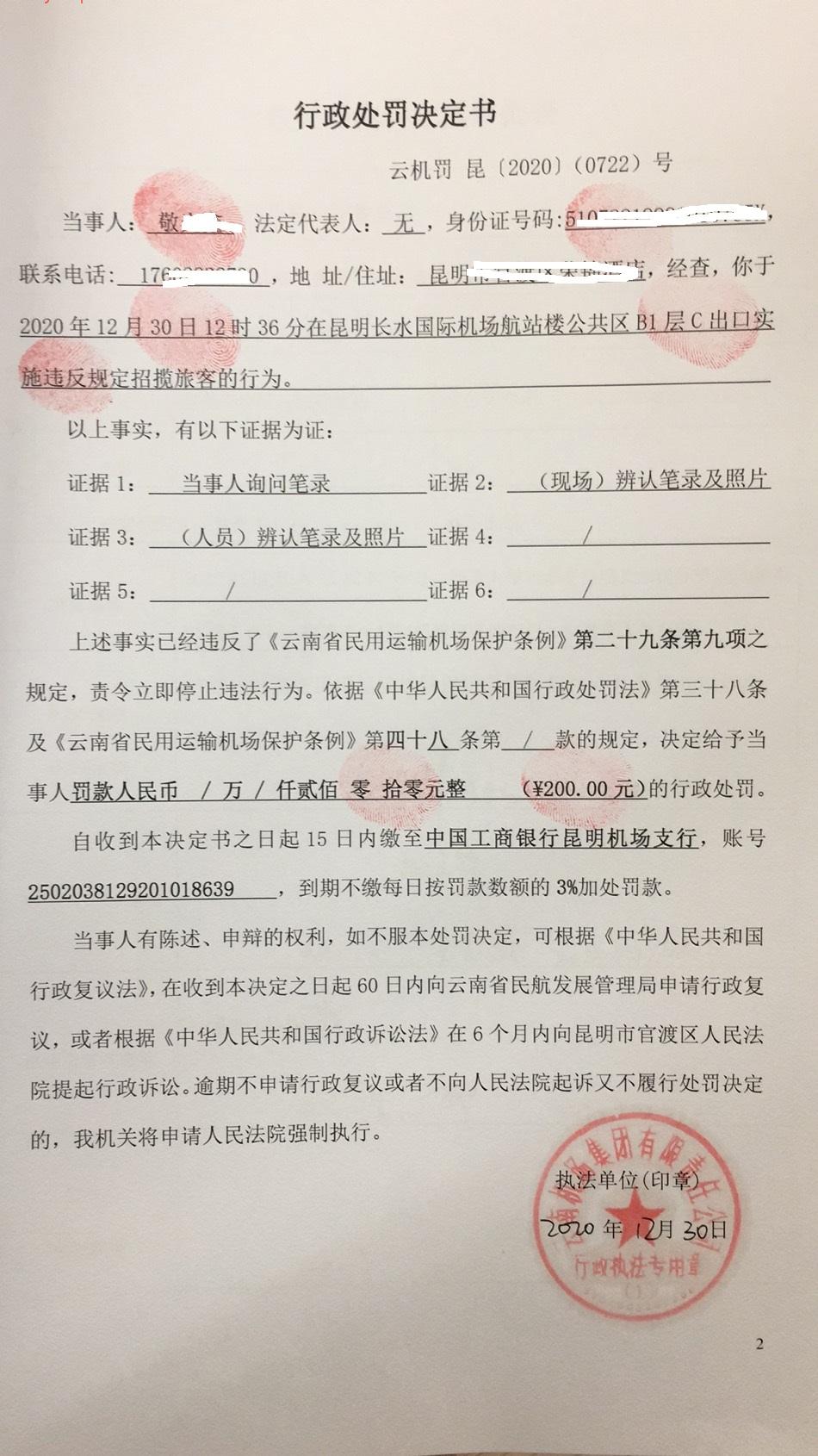 行政处罚决定书 云机罚 昆{2020} (0722)号