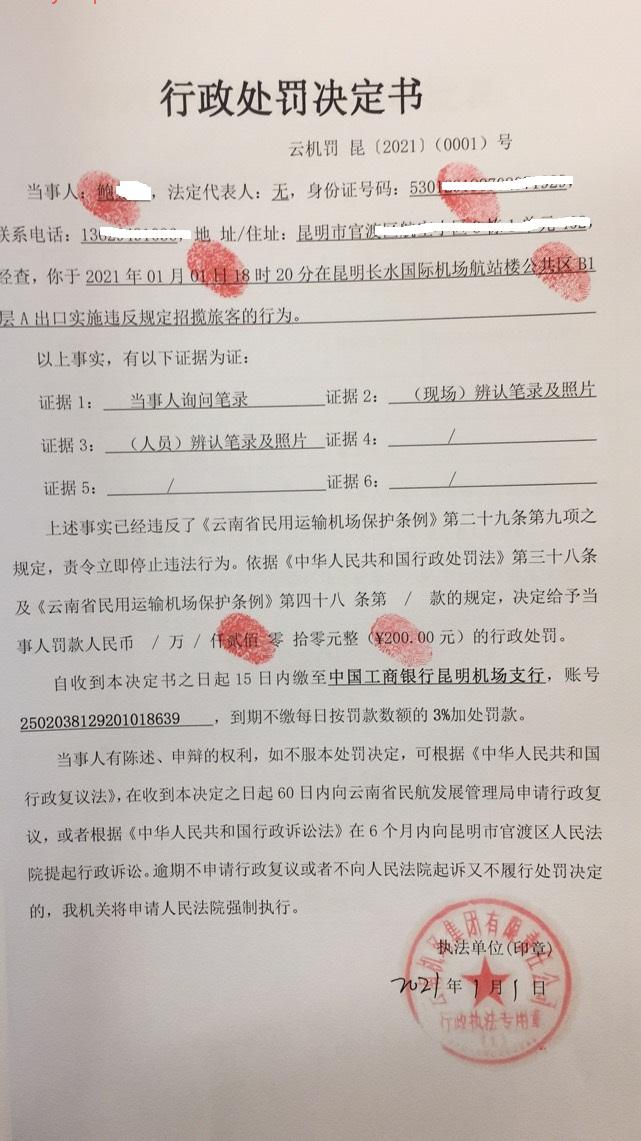 行政处罚决定书 云机罚 昆{2021} (0001)号