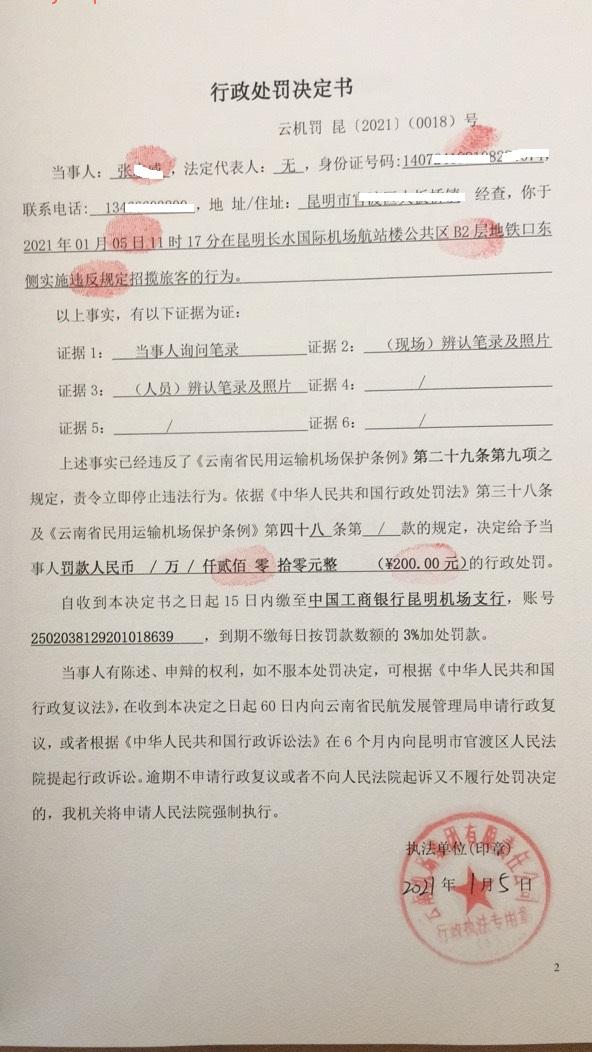 行政处罚决定书 云机罚 昆{2021} (0019)号