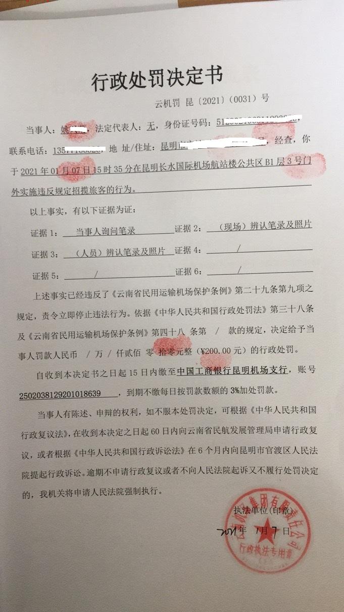 行政处罚决定书 云机罚 昆{2021} (0031)号