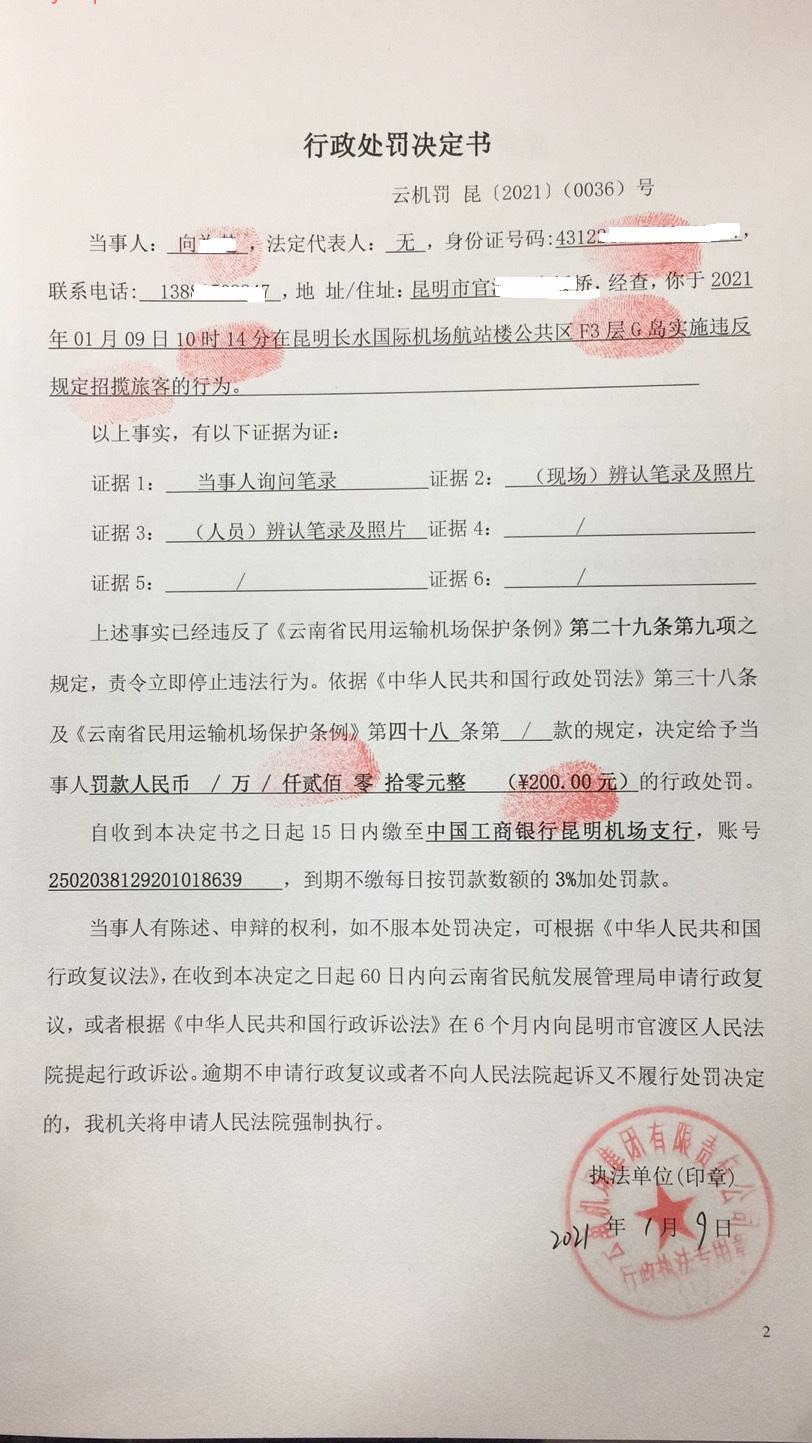 行政处罚决定书 云机罚 昆{2021} (0035)号