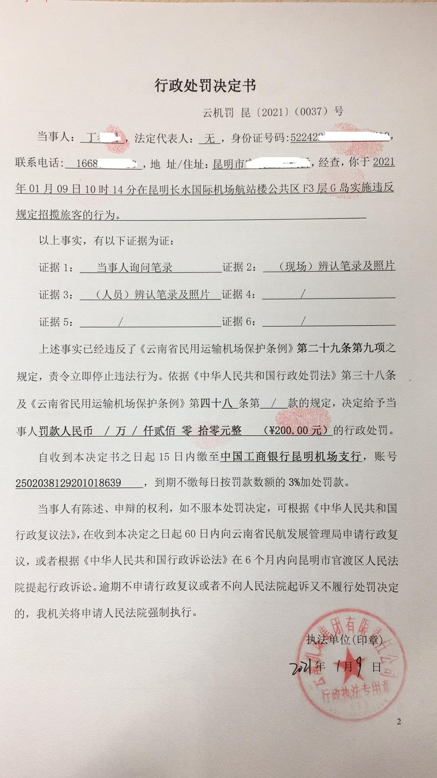 行政处罚决定书 云机罚 昆{2021} (0037)号