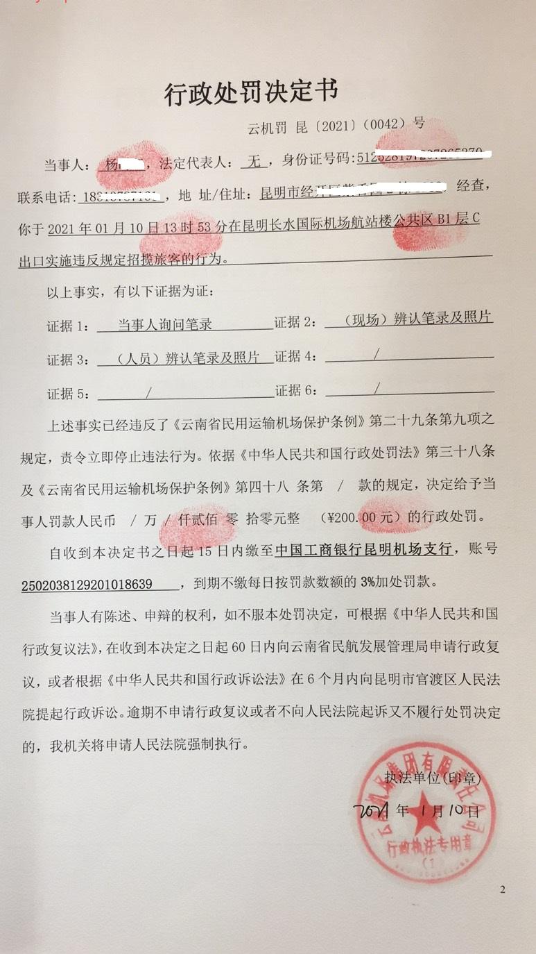 行政处罚决定书 云机罚 昆{2021} (0043)号