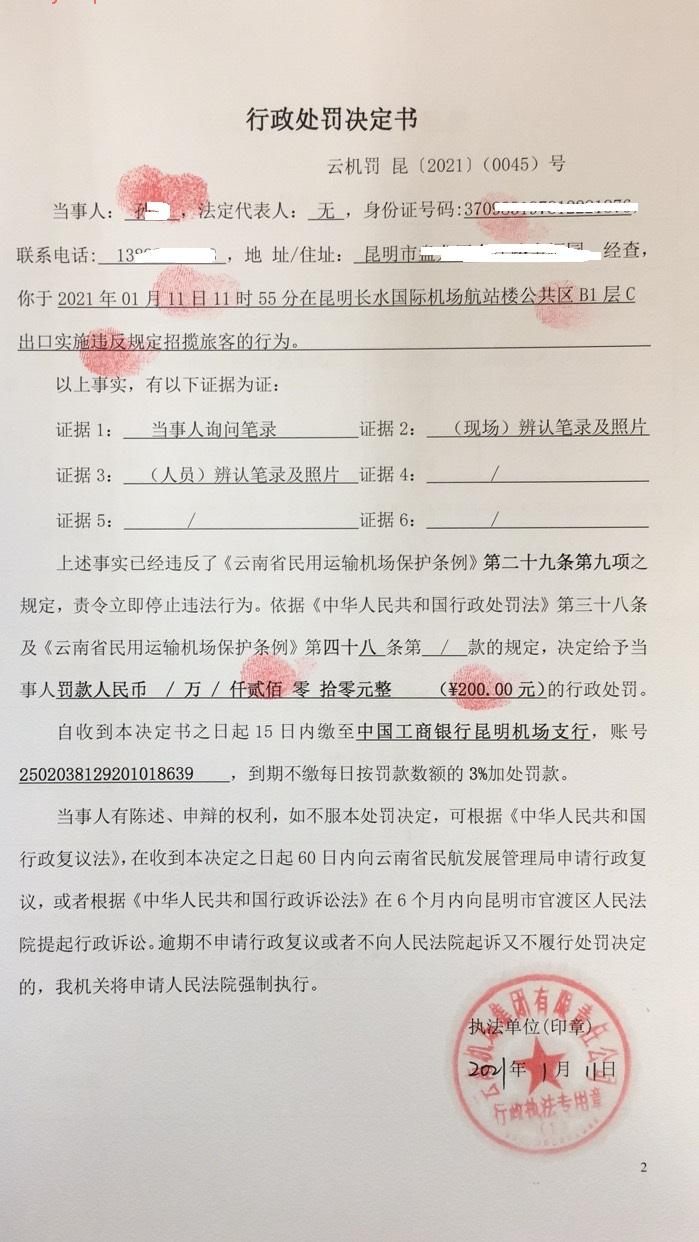 行政处罚决定书 云机罚 昆{2021} (0045)号