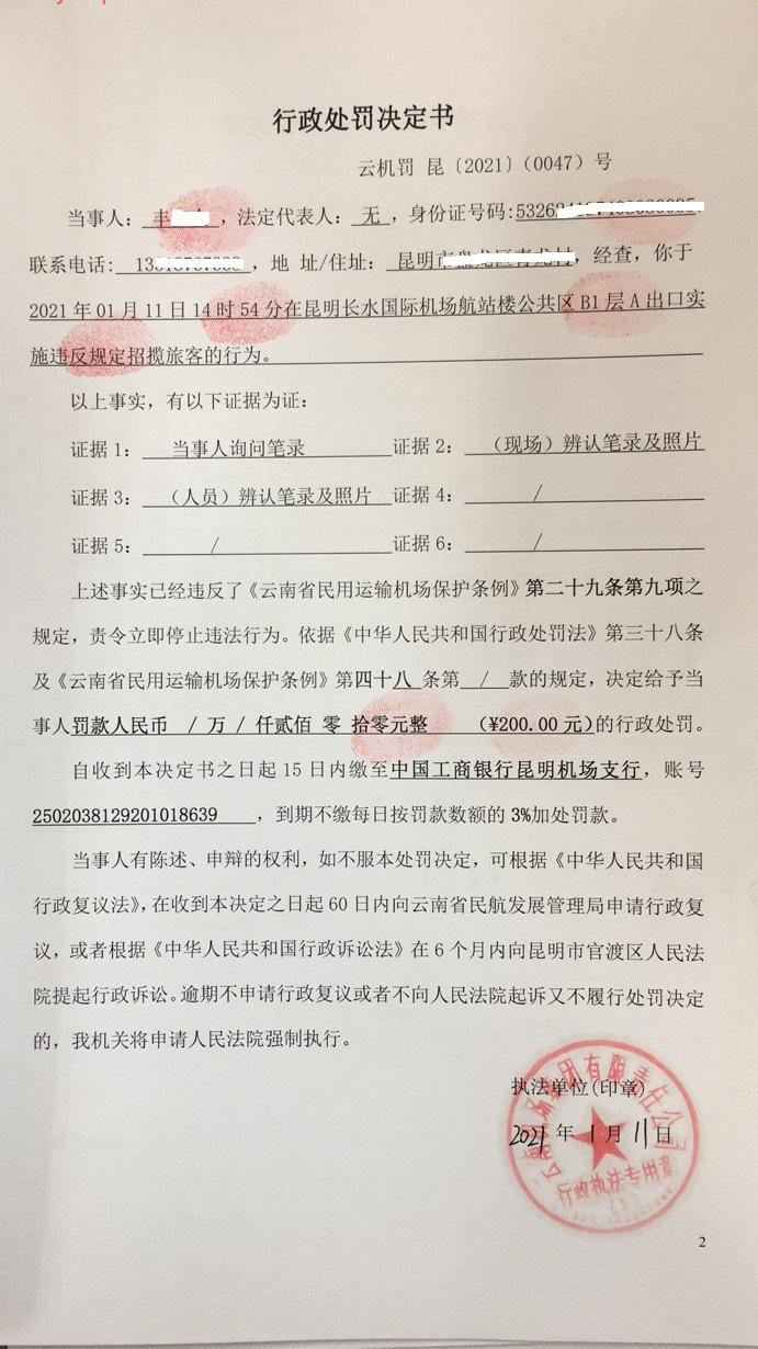 行政处罚决定书 云机罚 昆{2021} (0047)号