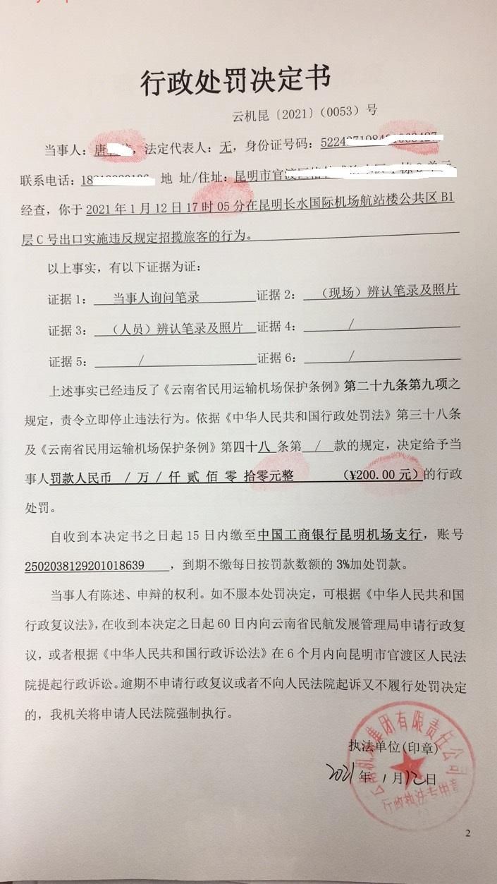 行政处罚决定书 云机罚 昆{2021} (0053)号