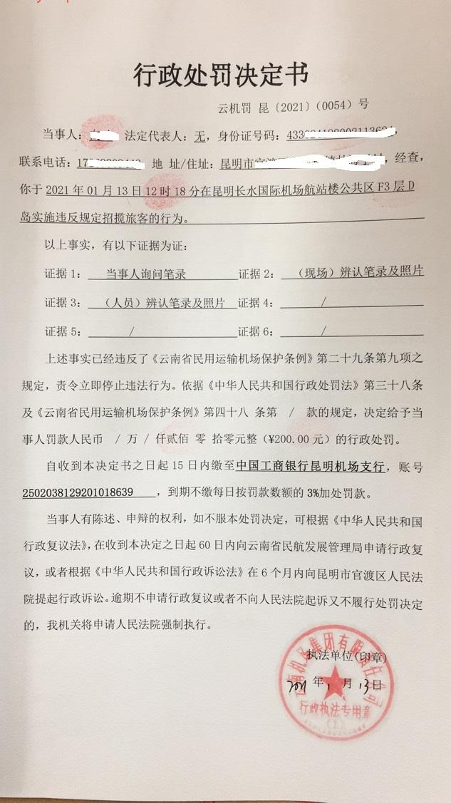 行政处罚决定书 云机罚 昆{2021} (0053)号