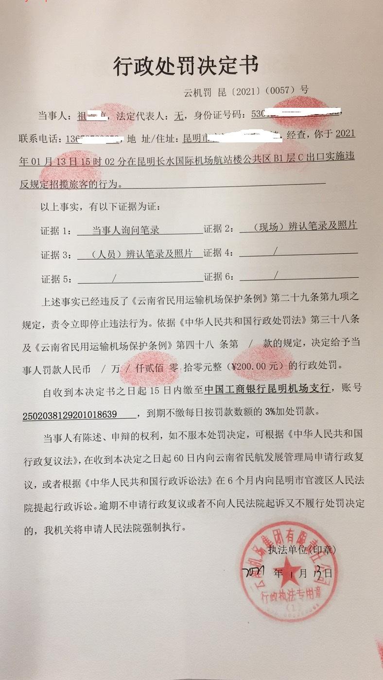 行政处罚决定书 云机罚 昆{2021} (0058)号