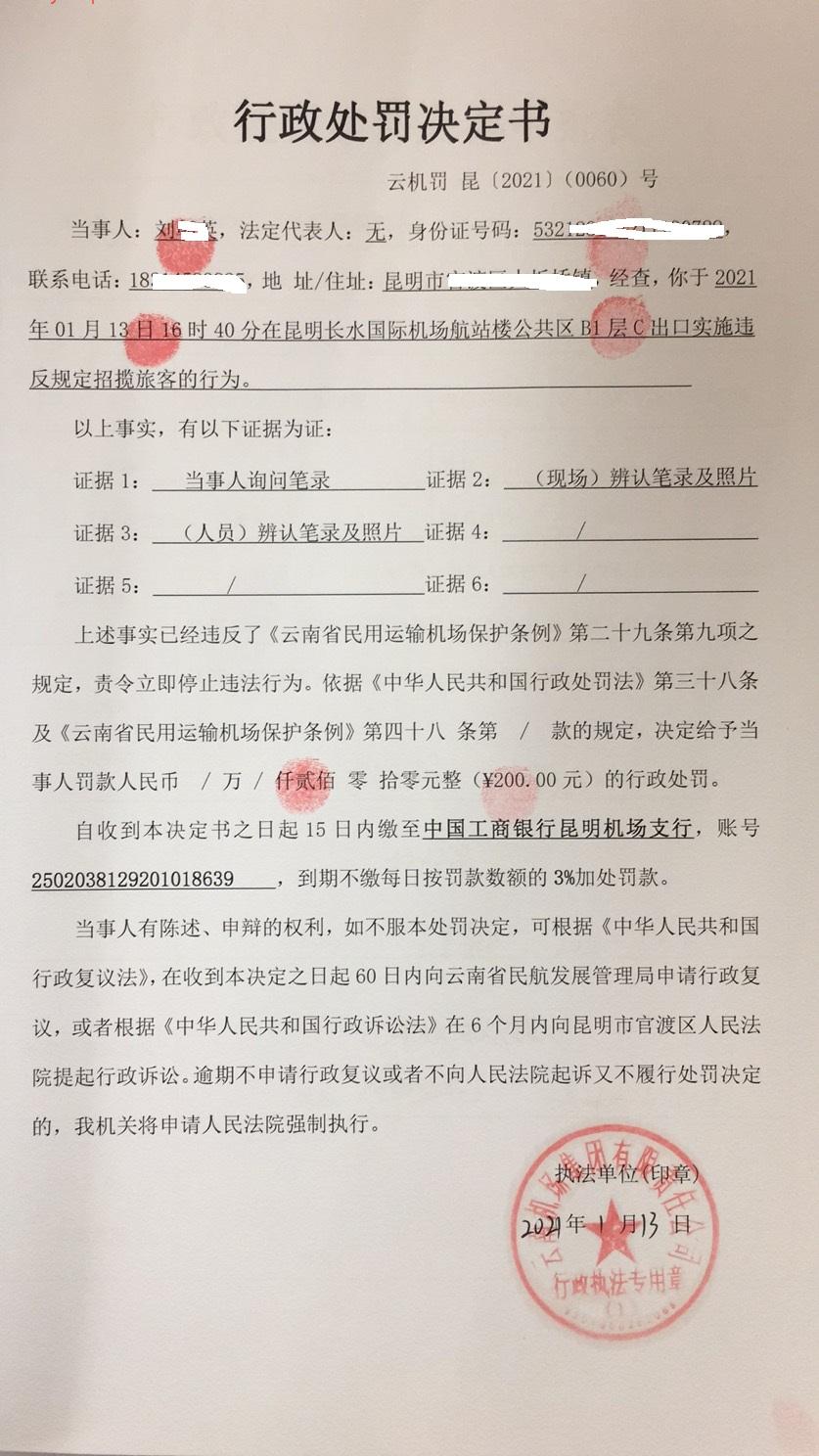 行政处罚决定书 云机罚 昆{2021} (0060)号