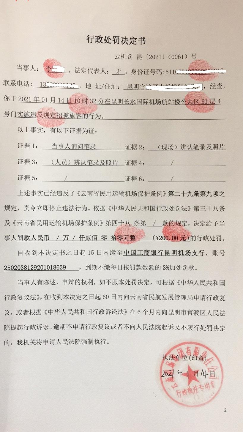 行政处罚决定书 云机罚 昆{2021} (0062)号