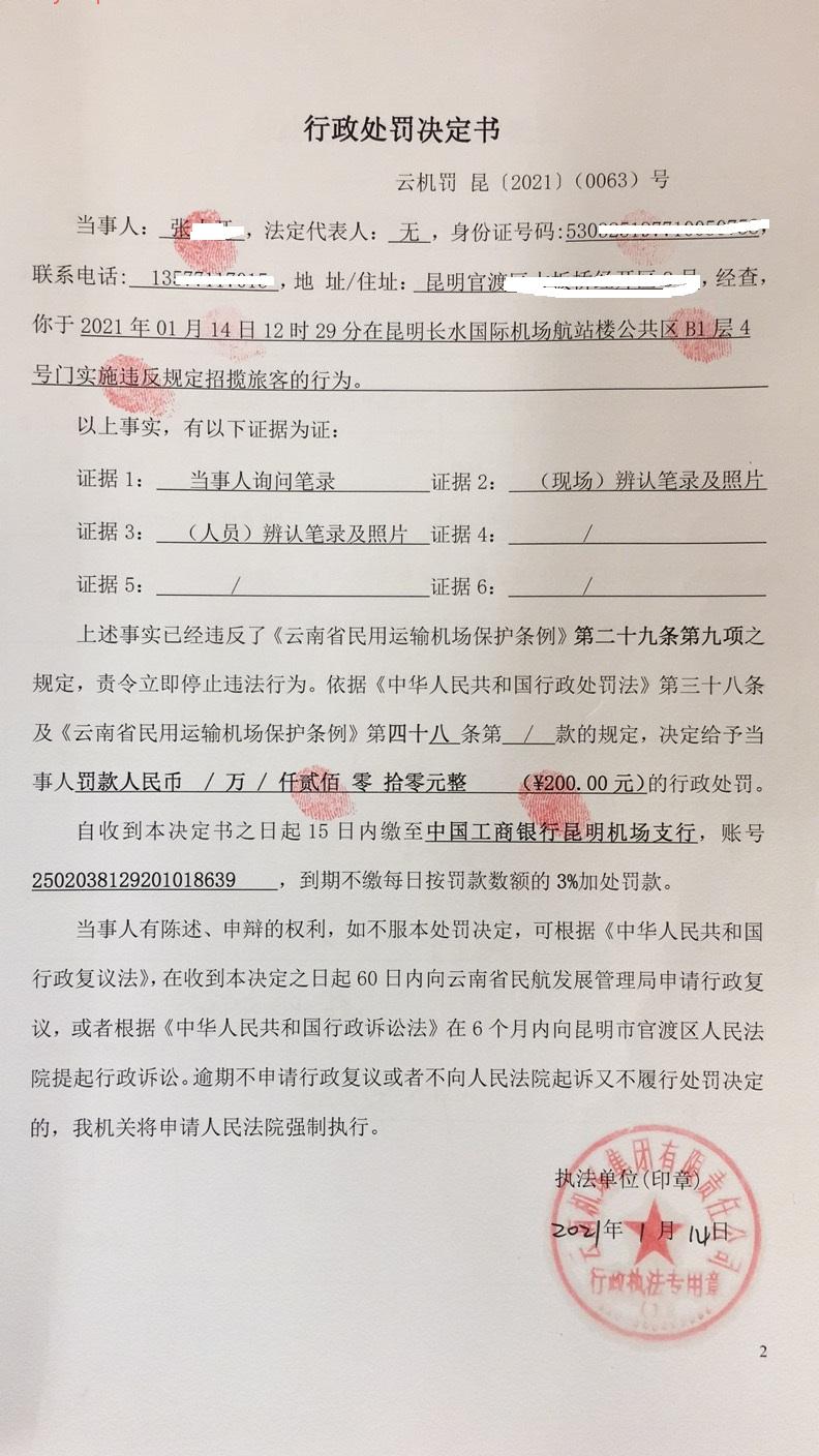 行政处罚决定书 云机罚 昆{2021} (0062)号