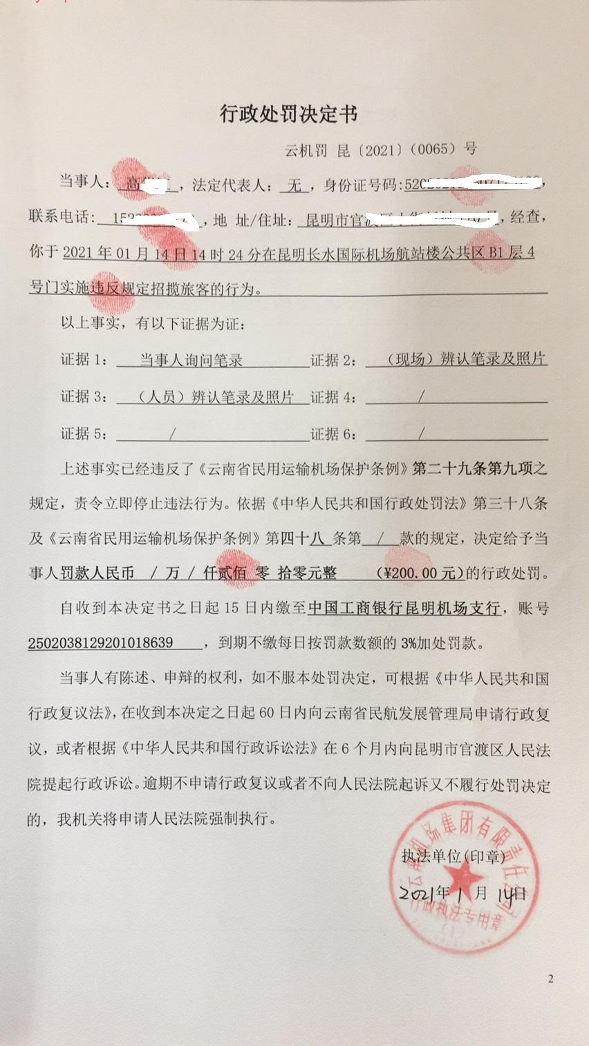 行政处罚决定书 云机罚 昆{2021} (0065)号