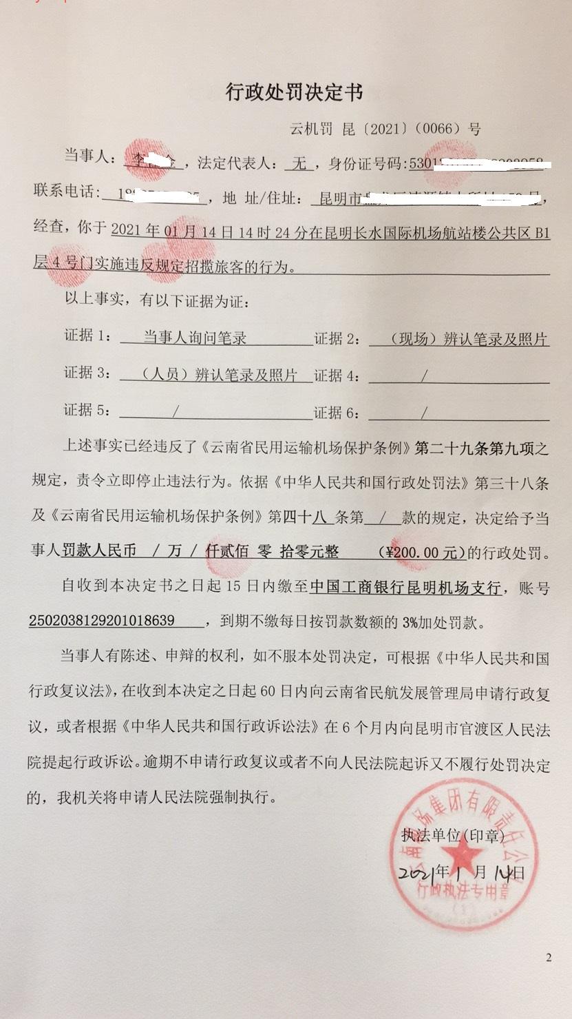 行政处罚决定书 云机罚 昆{2021} (0066)号