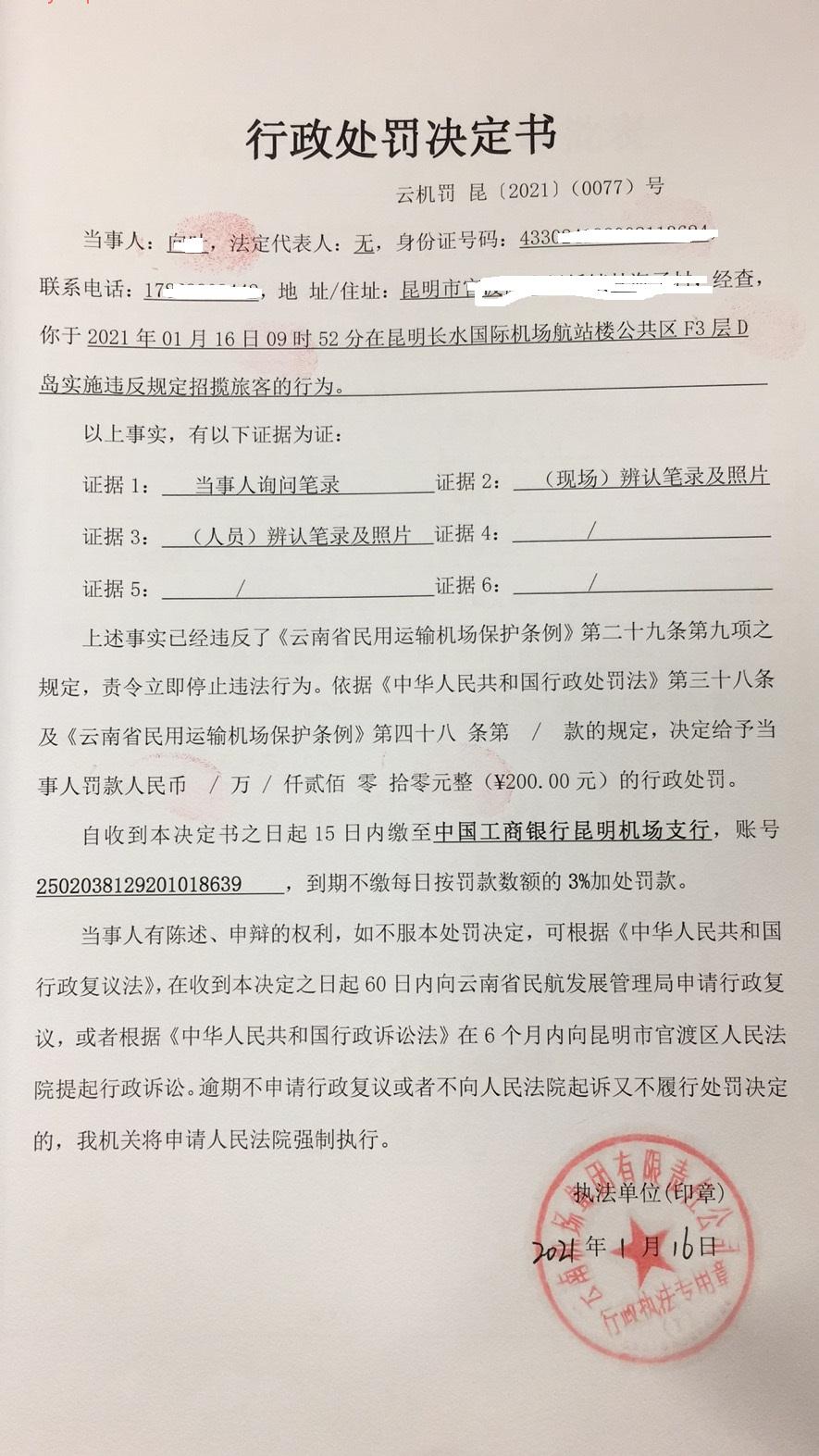 行政处罚决定书 云机罚 昆{2021} (0077)号