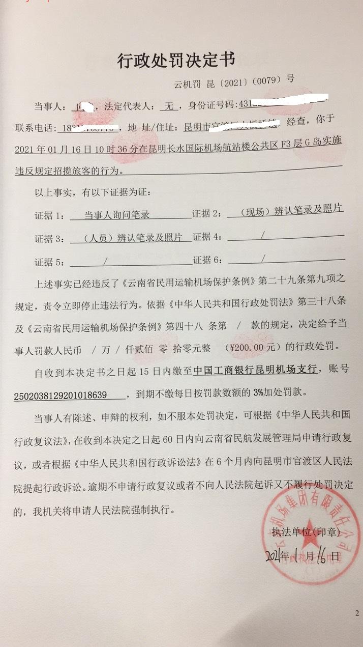 行政处罚决定书 云机罚 昆{2021} (0079)号