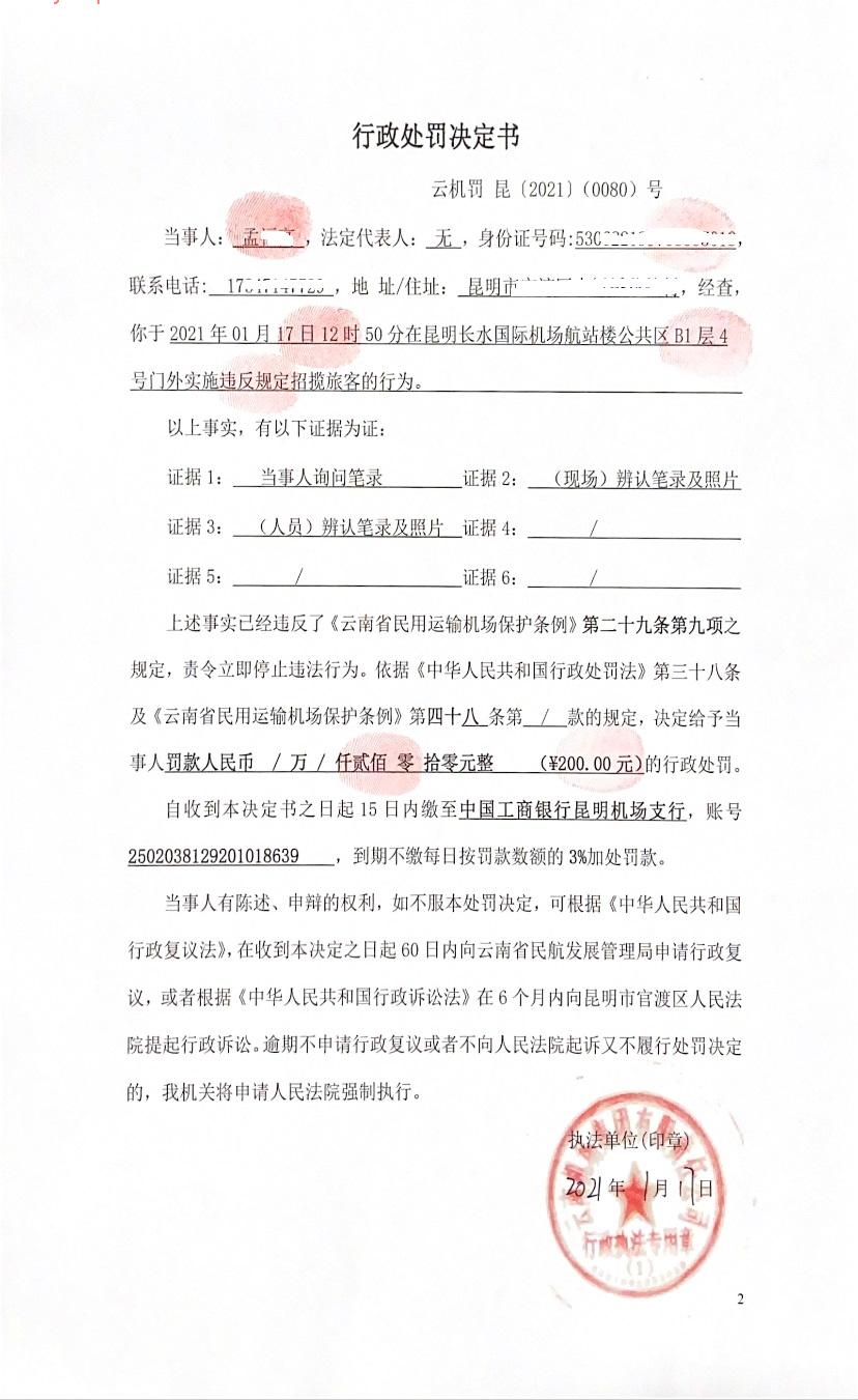 行政处罚决定书 云机罚 昆{2021} (0080)号
