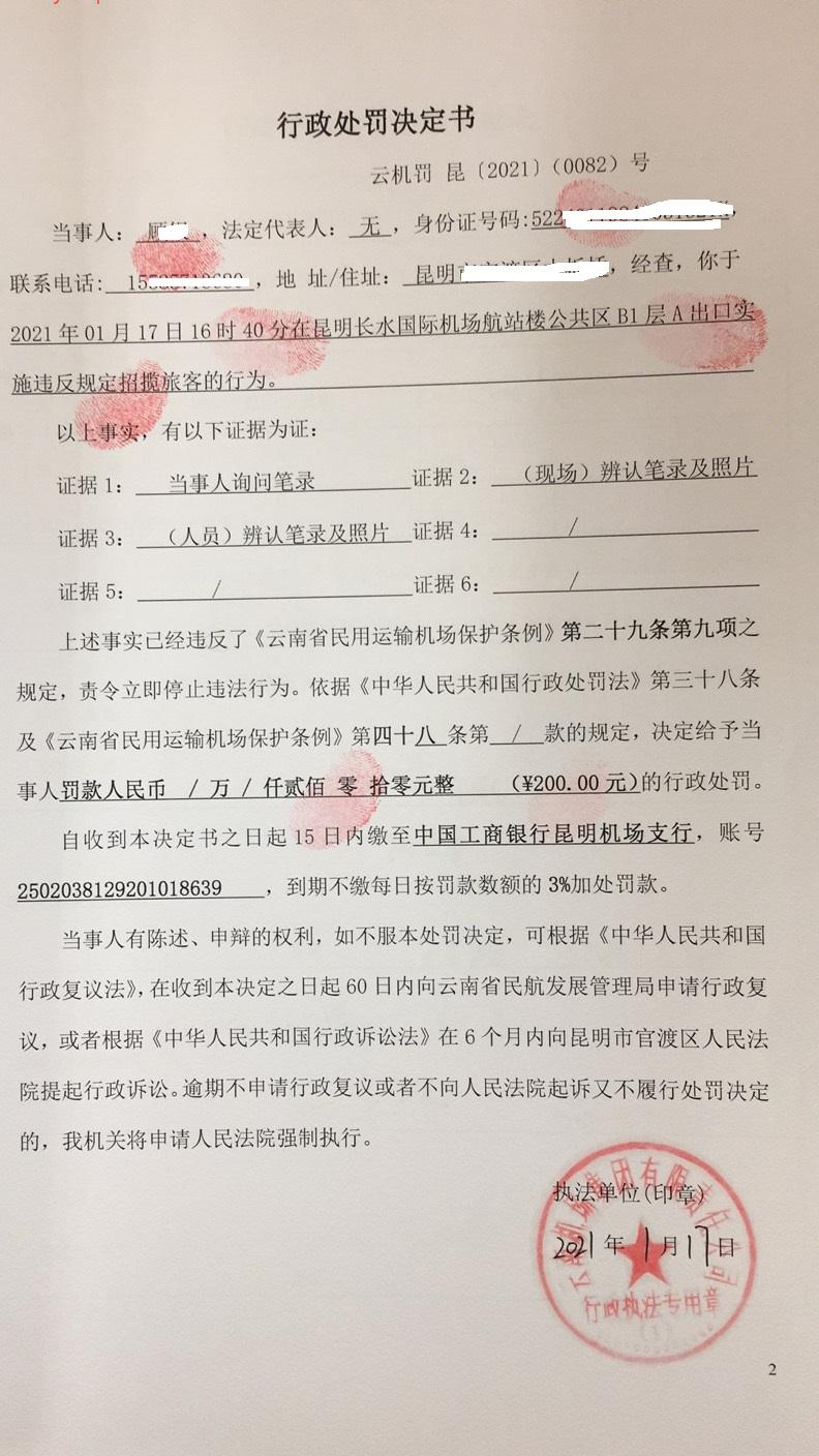 行政处罚决定书 云机罚 昆{2021} (0082)号