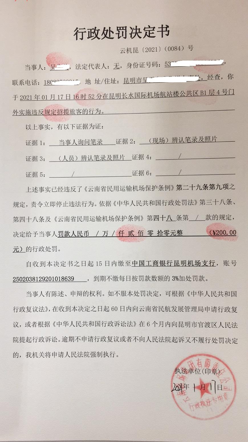 行政处罚决定书 云机罚 昆{2021} (0084)号