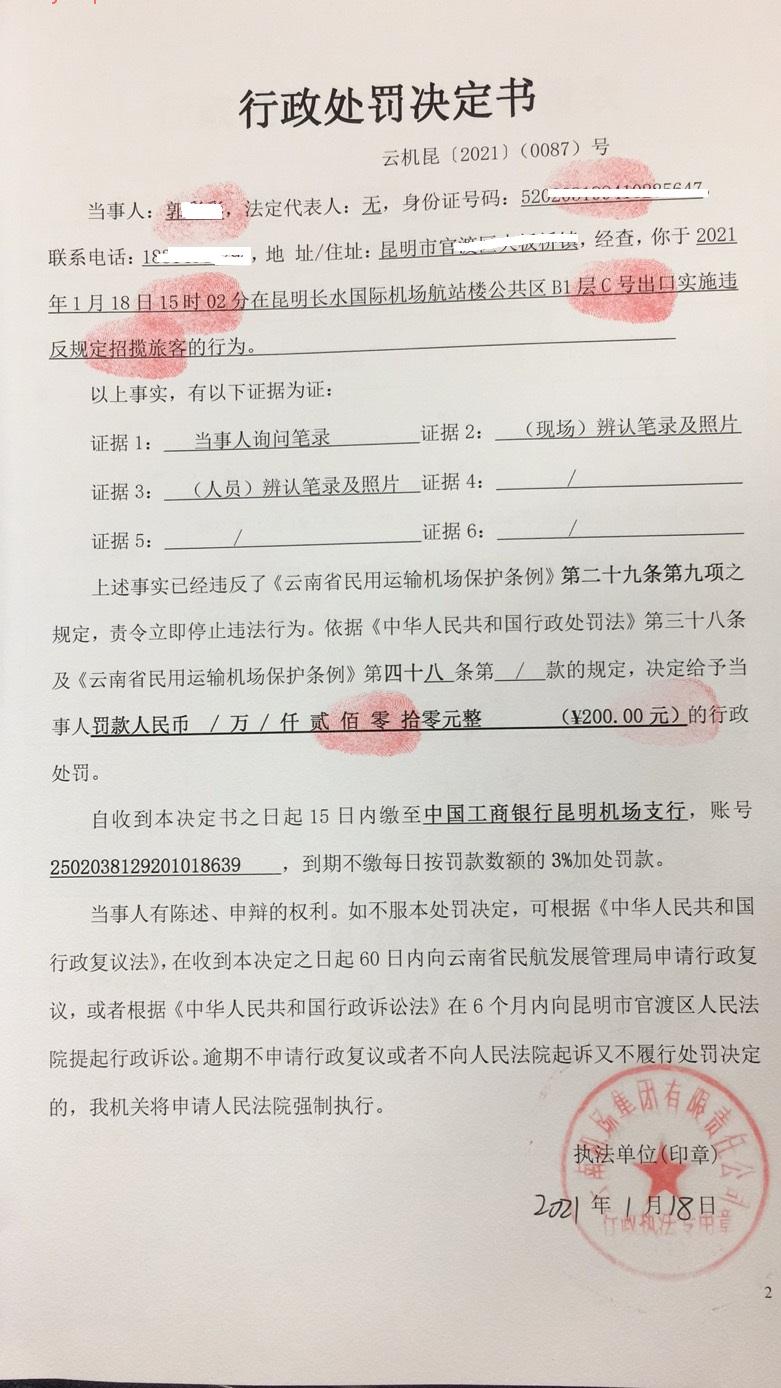 行政处罚决定书 云机罚 昆{2021} (0086)号