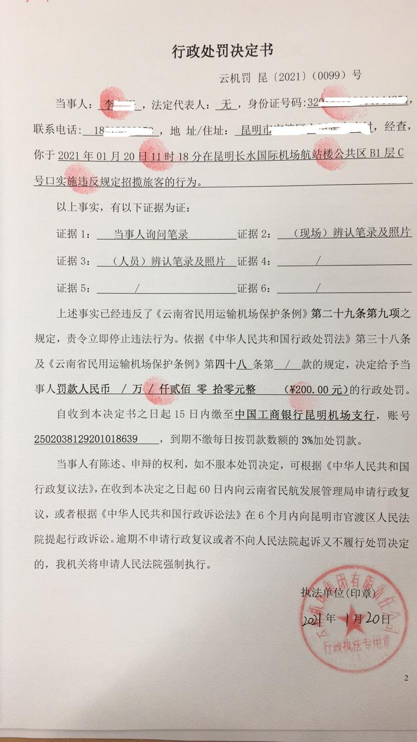 行政处罚决定书 云机罚 昆{2021} (0098)号