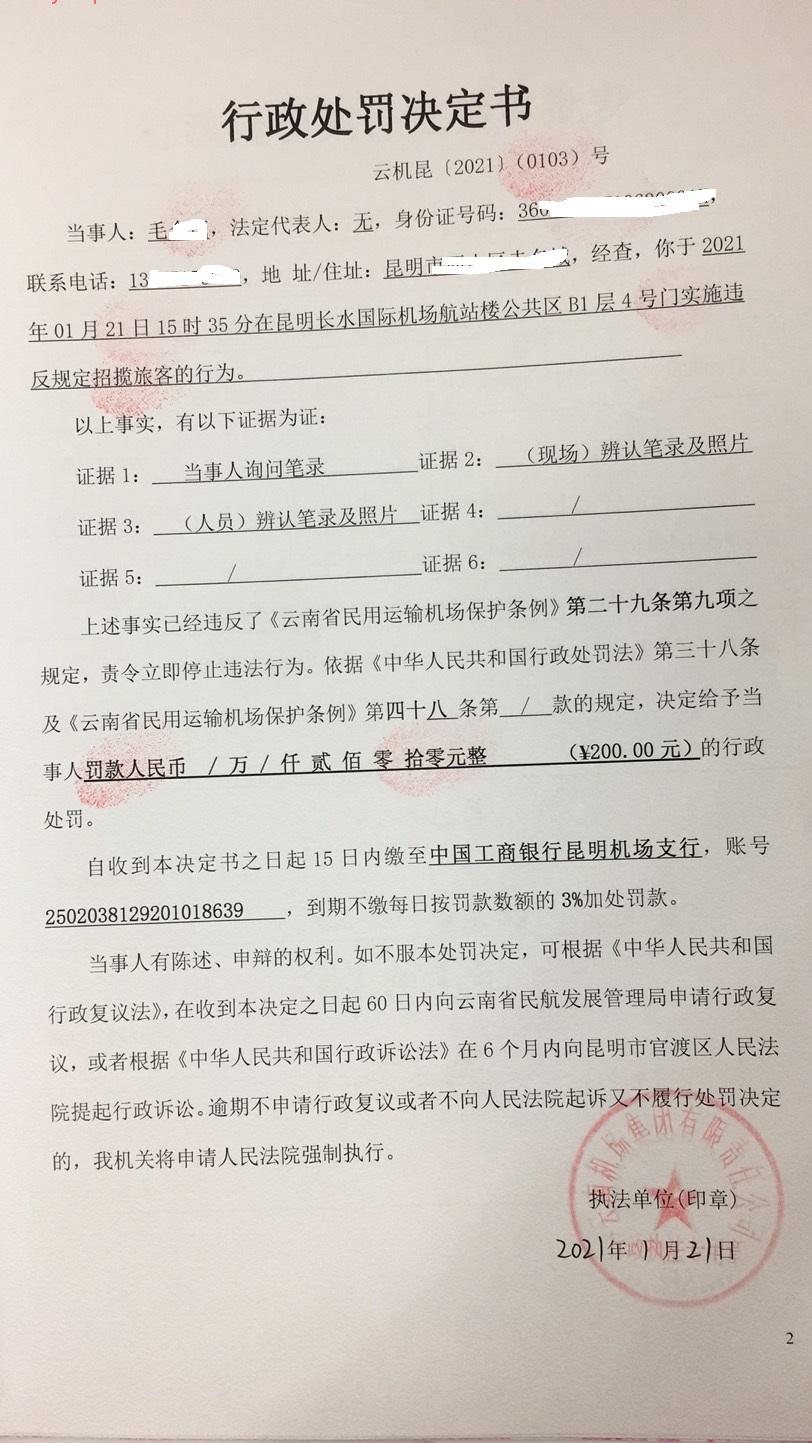 行政处罚决定书 云机罚 昆{2021} (0102)号