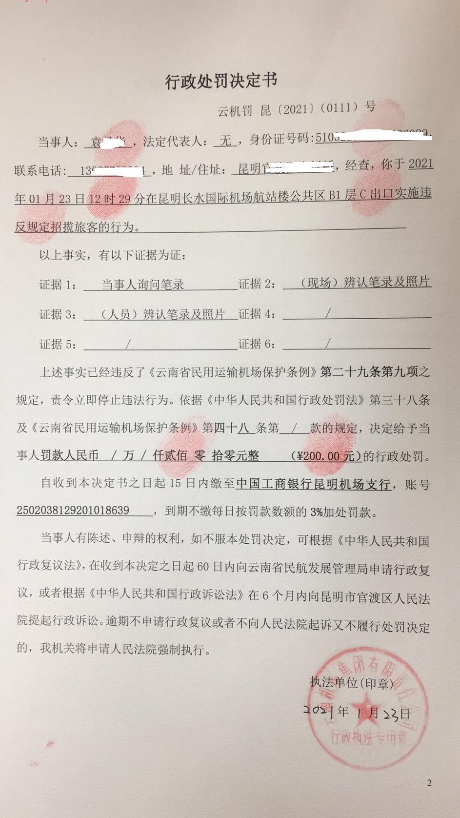 行政处罚决定书 云机罚 昆{2021} (0112)号