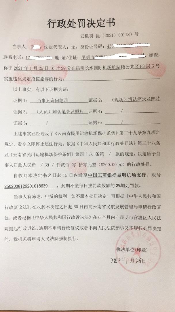 行政处罚决定书 云机罚 昆{2021} (0118)号