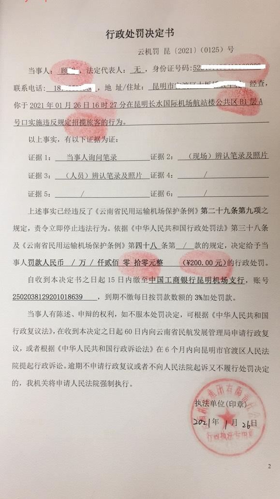 行政处罚决定书 云机罚 昆{2021} (0126)号
