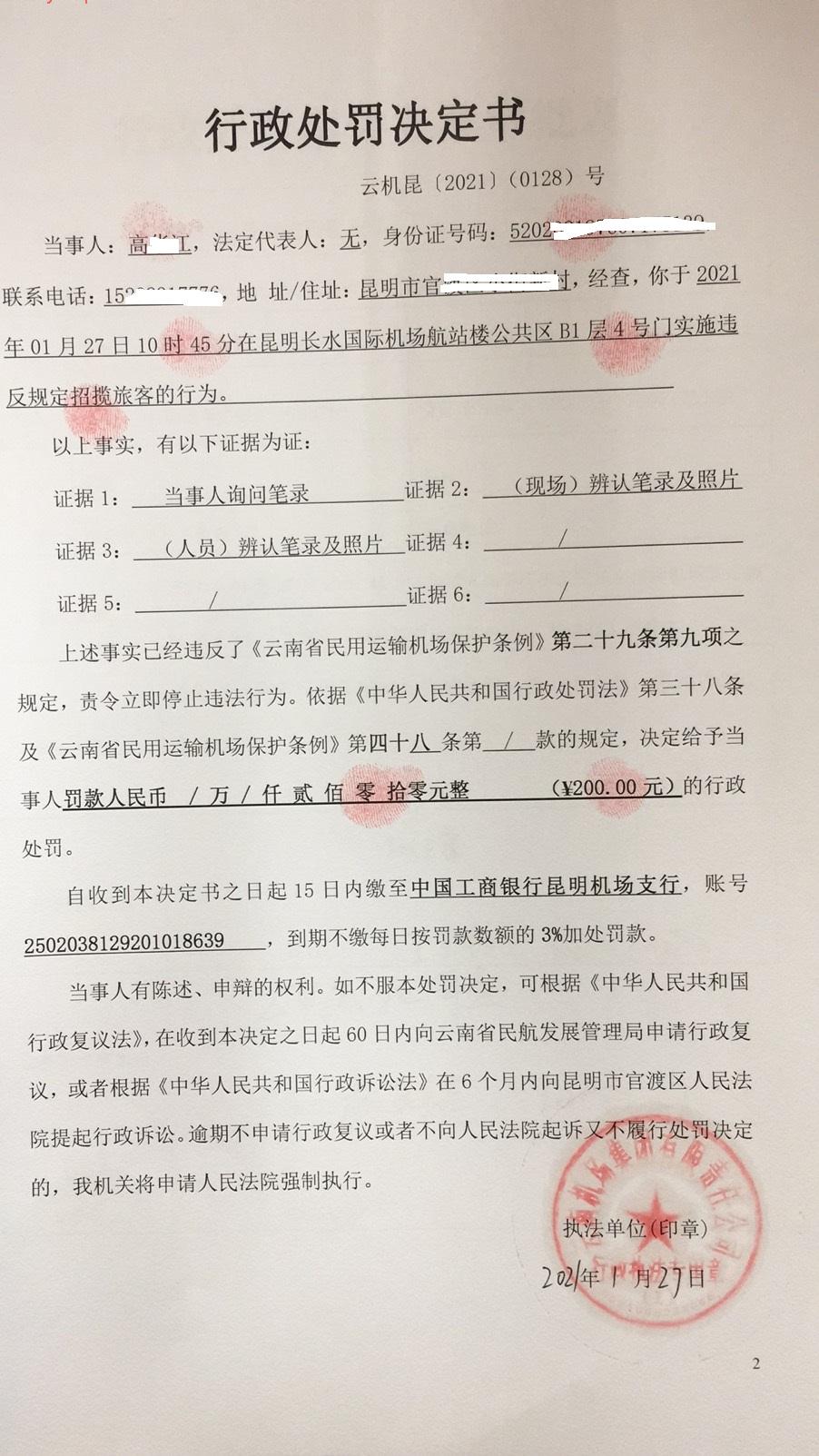 行政处罚决定书 云机罚 昆{2021} (0127)号