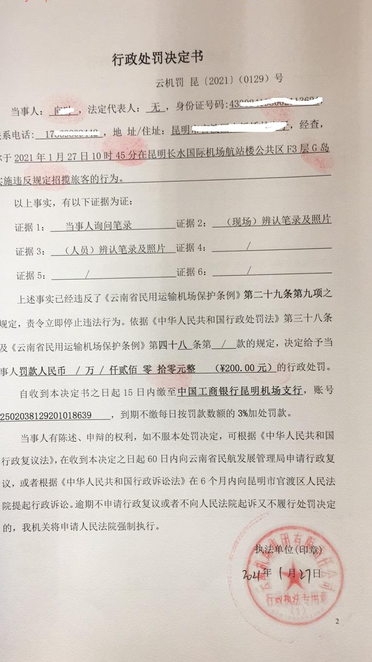 行政处罚决定书 云机罚 昆{2021} (0129)号