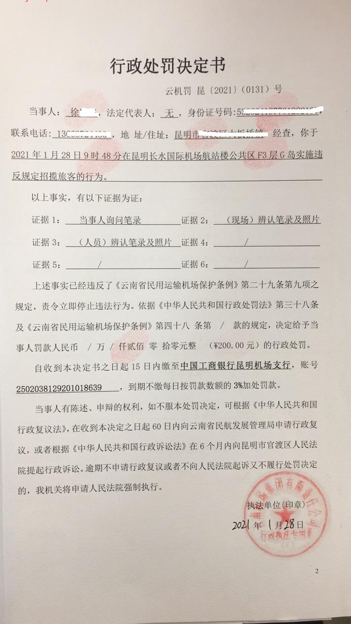 行政处罚决定书 云机罚 昆{2021} (0132)号