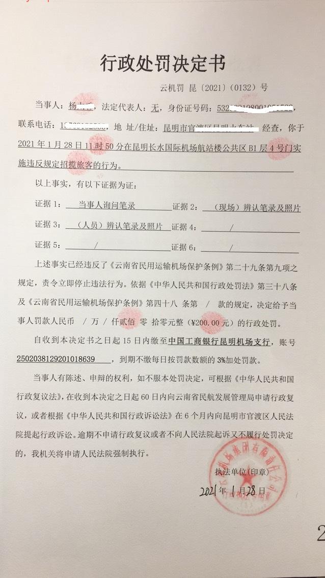行政处罚决定书 云机罚 昆{2021} (0132)号