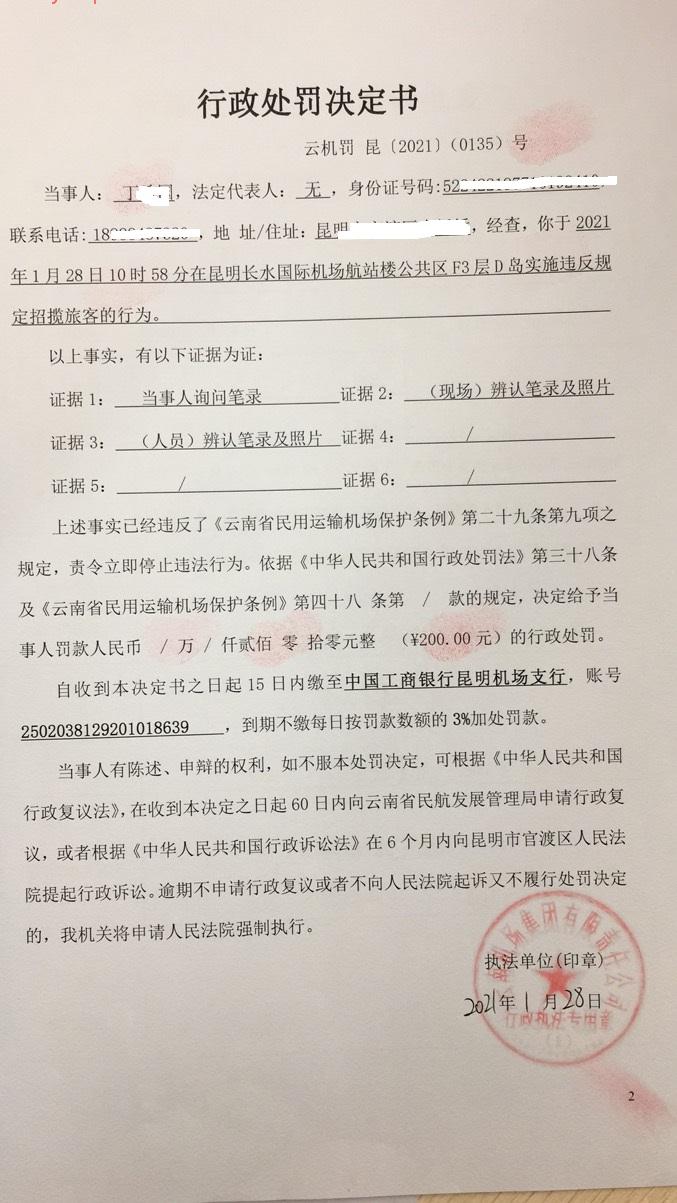 行政处罚决定书 云机罚 昆{2021} (0136)号