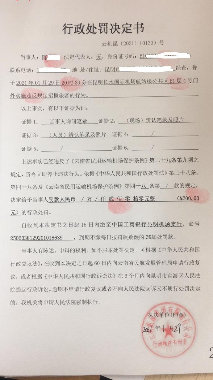 行政处罚决定书 云机罚 昆{2021} (0138)号