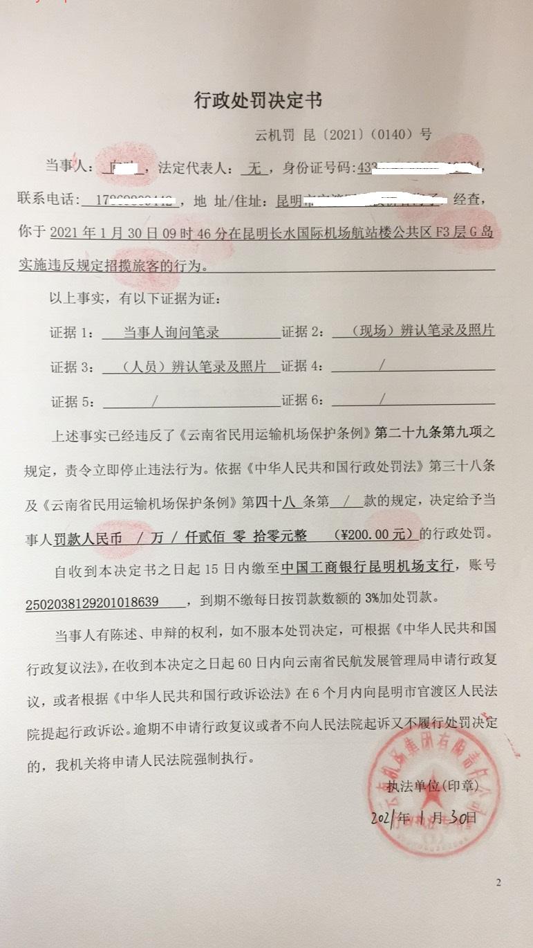 行政处罚决定书 云机罚 昆{2021} (0140)号