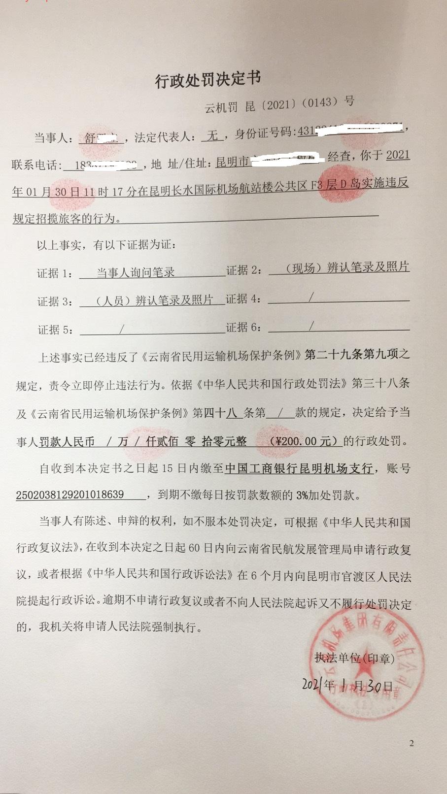 行政处罚决定书 云机罚 昆{2021} (0143)号