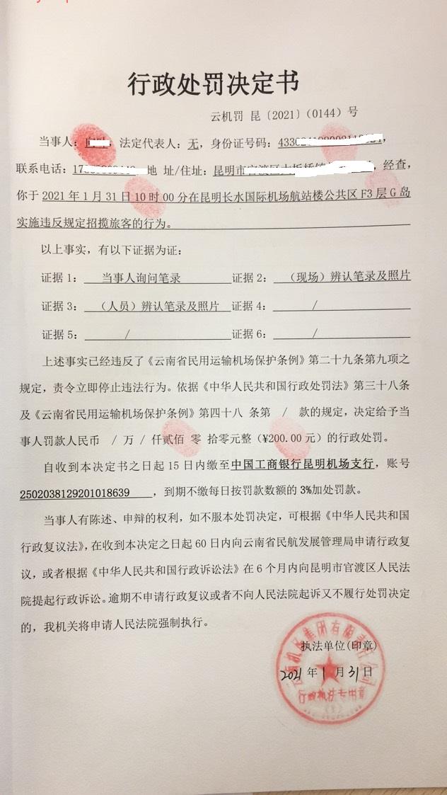 行政处罚决定书 云机罚 昆{2021} (0144)号