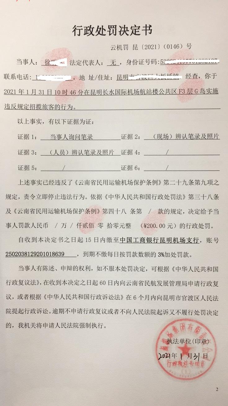 行政处罚决定书 云机罚 昆{2021} (0146)号