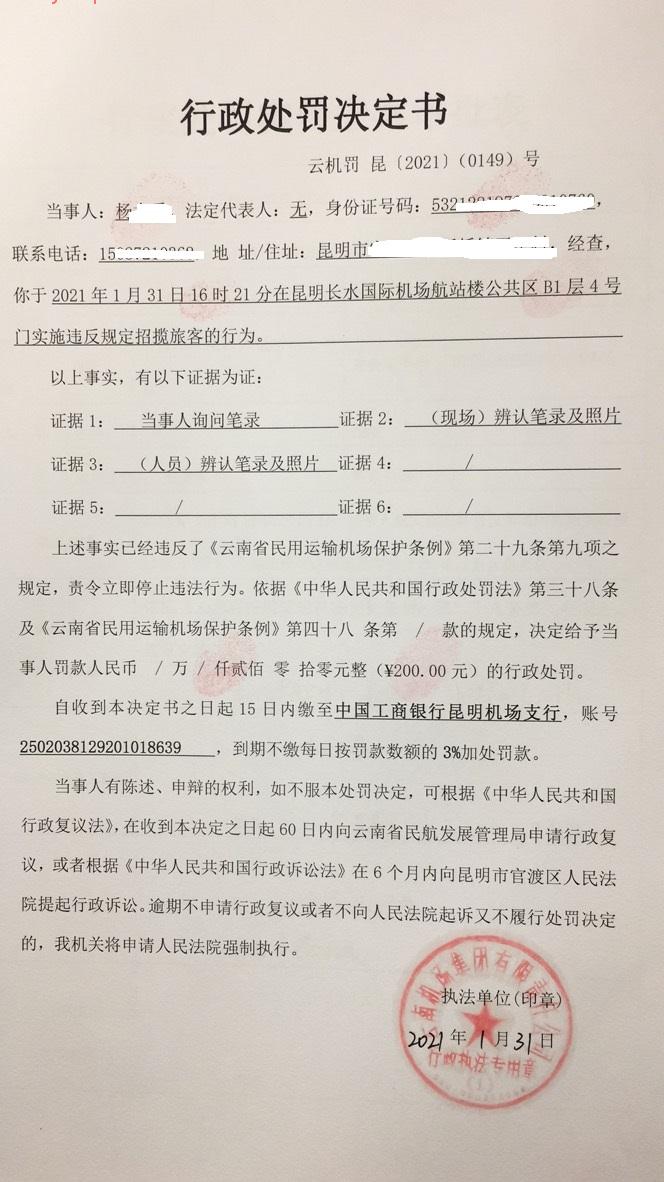 行政处罚决定书 云机罚 昆{2021} (0149)号
