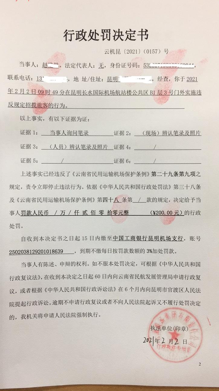 行政处罚决定书 云机罚 昆{2021} (0156)号