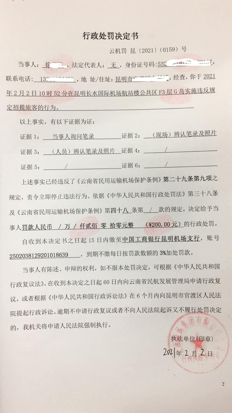 行政处罚决定书 云机罚 昆{2021} (0158)号