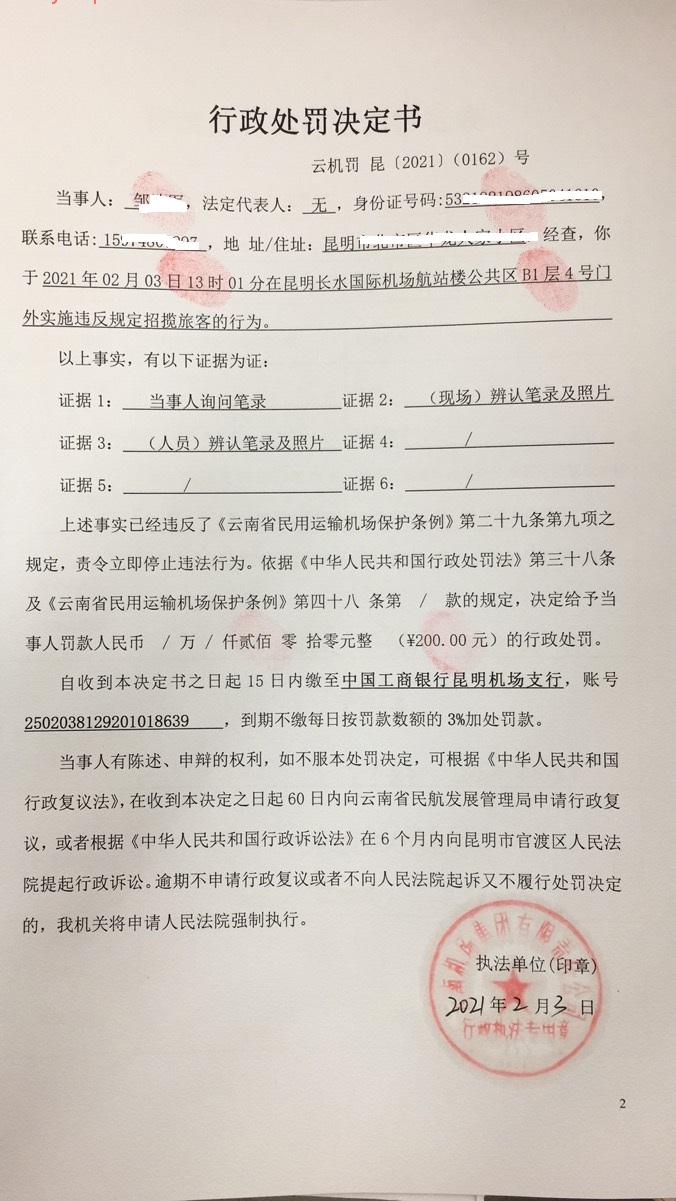 行政处罚决定书 云机罚 昆{2021} (0163)号
