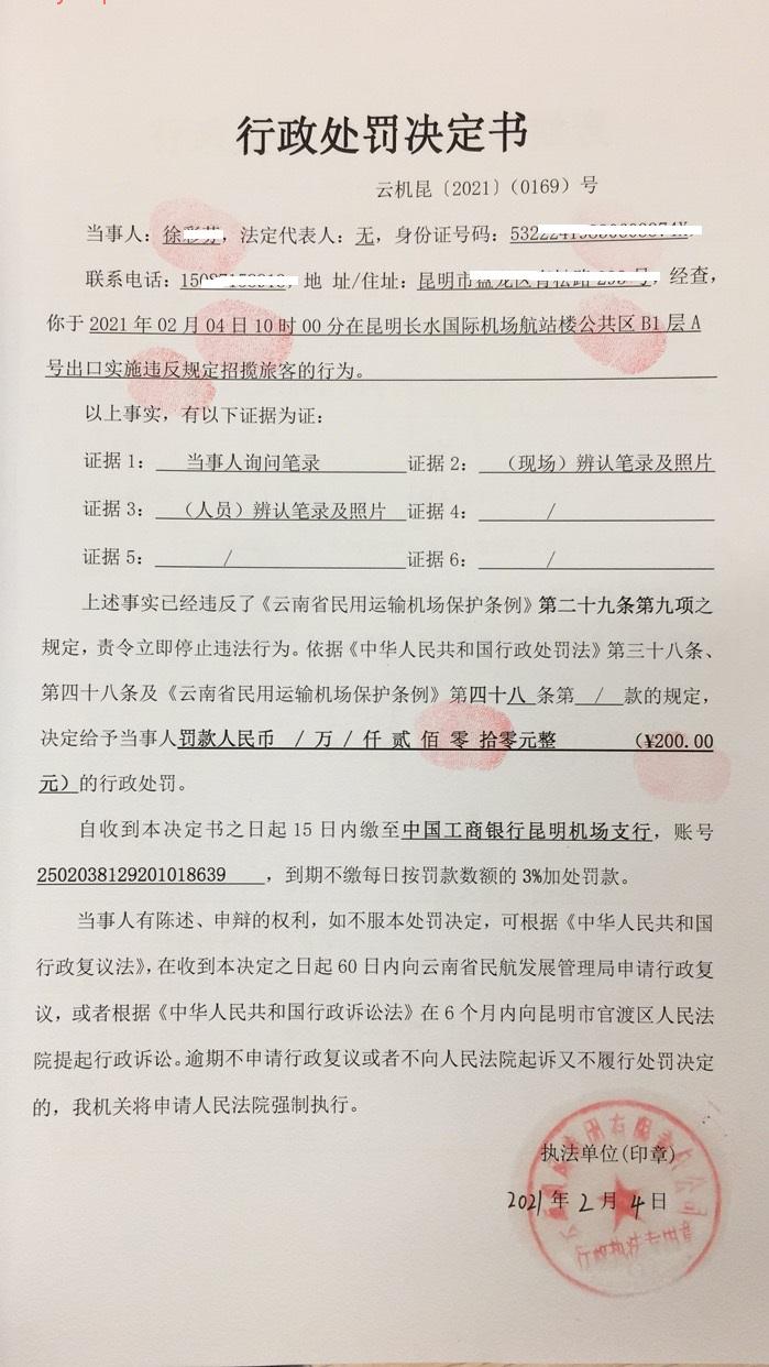 行政处罚决定书 云机罚 昆{2021} (0169)号