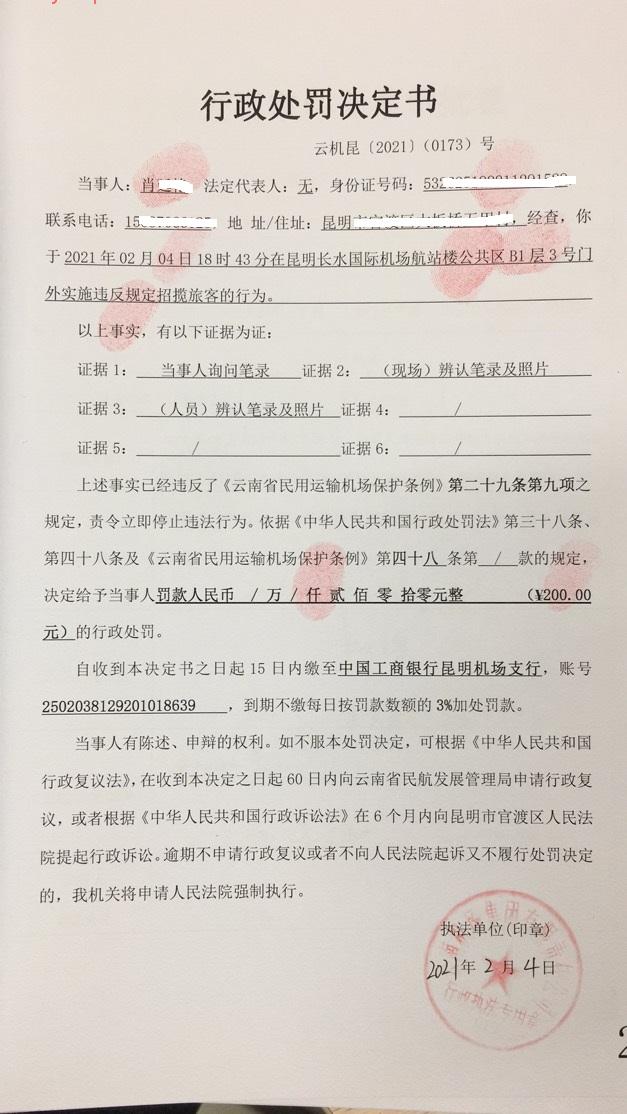 行政处罚决定书 云机罚 昆{2021} (0173)号