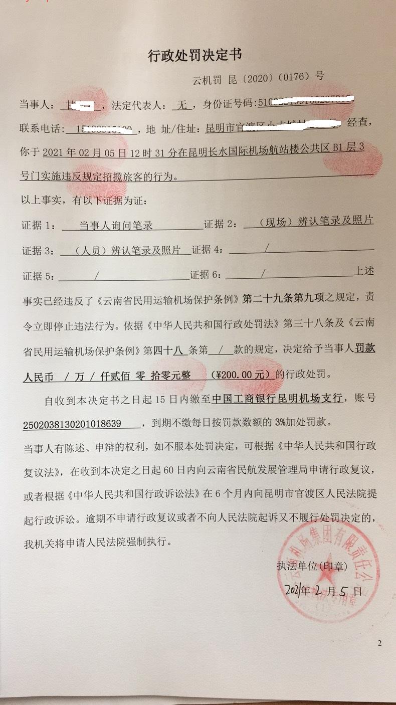 行政处罚决定书 云机罚 昆{2021} (0176)号