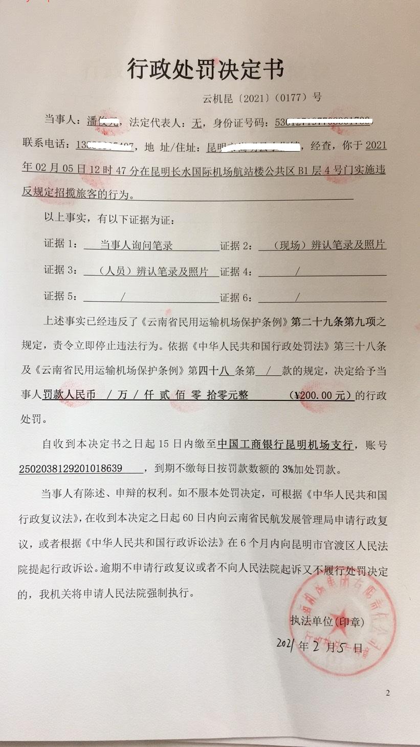 行政处罚决定书 云机罚 昆{2021} (0177)号
