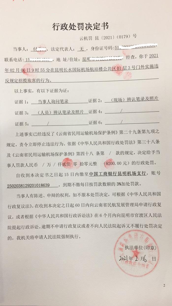 行政处罚决定书 云机罚 昆{2021} (0179)号